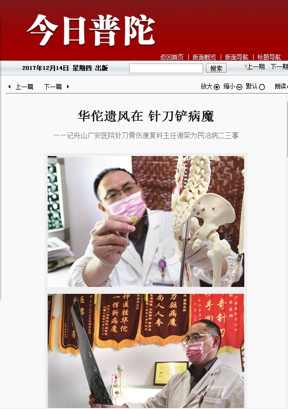 “你動一動,現(xiàn)在癥狀改善沒有? "筆者剛走迸廣安醫(yī)院針刀康復(fù)科,謝榮醫(yī)生正在屏風(fēng)里面給一位病人治病。病人起身,揺揺手臂,高米地回答:“現(xiàn)在不痛了,比以前好多了。"