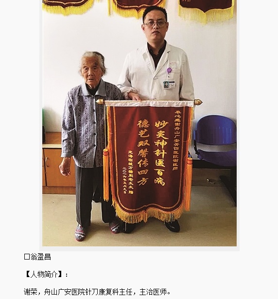 54歲患者蔡女士,年幼時(shí),因長期側(cè)睡體位,造成斜頸。謝榮用小針刀治療不到5分鐘,斜頸明顯改善了,病人甚是高興。沈家門黃老太太,因?yàn)橥达L(fēng)- -周不能走路,謝醫(yī)生用針灸加中藥外敷,第二天就可以下地走路。平陽浦57歲的張老漢,因?yàn)槎喟l(fā)性神經(jīng)炎,不能走路,生活不能自理,大醫(yī)院醫(yī)生說這病看不好??煲^望之時(shí),去年6月來到廣安醫(yī)院接受謝醫(yī)生治療,-一個(gè)月后,能行走,生活能自理。