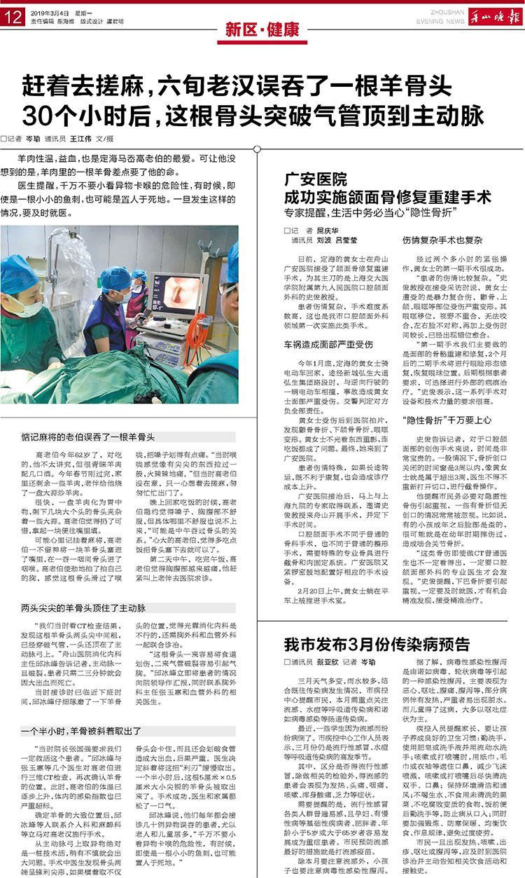 日前,定海的黃女士在舟山廣安醫(yī)院接受了頜面骨修復(fù)重建手術(shù),為其主刀的是上海交大醫(yī)學(xué)院附屬第九人民醫(yī)院口腔頜面外科的史俊教授。
