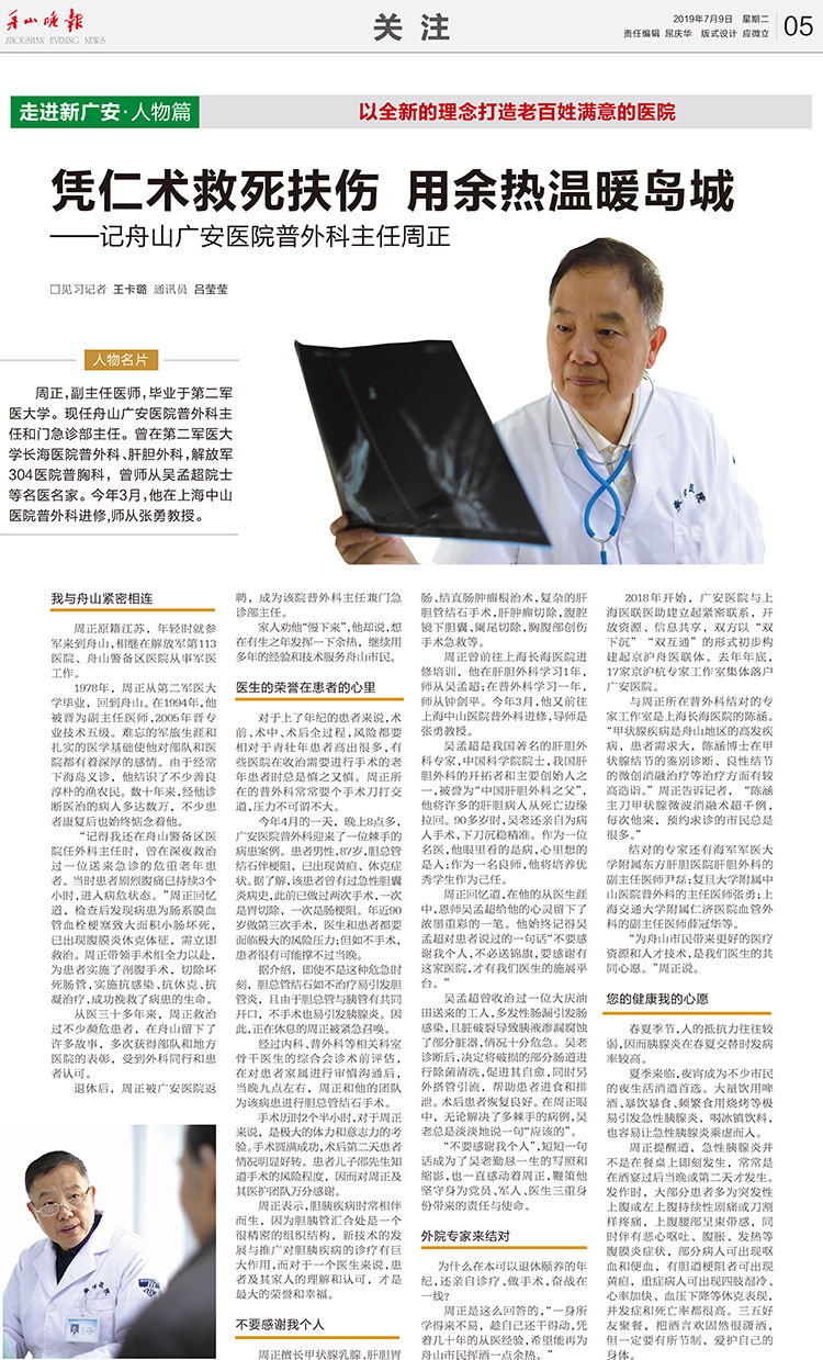 周正,副主任醫(yī)師,畢業(yè)于第二軍醫(yī)大學(xué)。現(xiàn)任舟山廣安醫(yī)院普外科主任和門急診部主任。曾在第二軍醫(yī)大學(xué)長(zhǎng)海醫(yī)院普外科、肝膽外科,解放軍304醫(yī)院胸外科進(jìn)修學(xué)習(xí),曾師從吳孟超院士等名醫(yī)名家。今年初,他在上海中山醫(yī)院普外科進(jìn)修,師從張勇教授。