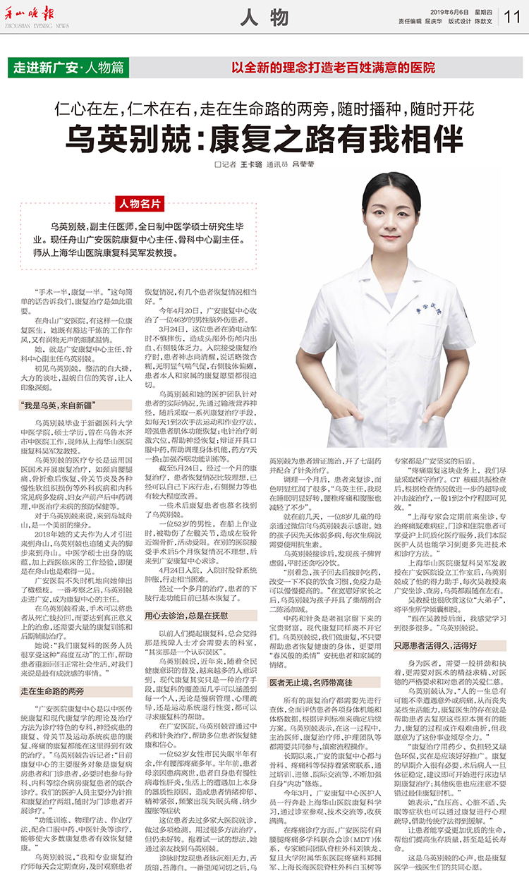 烏英別兢,副主任醫(yī)師,全日制中醫(yī)學(xué)碩士研究生畢業(yè)?,F(xiàn)任舟山廣安醫(yī)院康復(fù)中心主任、骨科中心副主任。師從上海華山醫(yī)院康復(fù)科吳軍發(fā)教授。