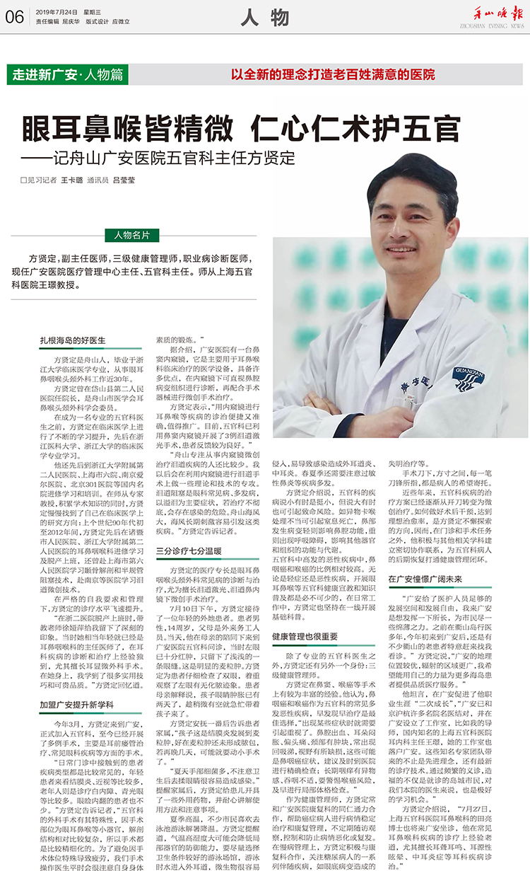 方賢定,副主任醫(yī)師,三級健康管理師,職業(yè)病診斷醫(yī)師,現(xiàn)任廣安醫(yī)院醫(yī)療管理中心主任、五官科主任。師從上海五官科醫(yī)院王璟教授。