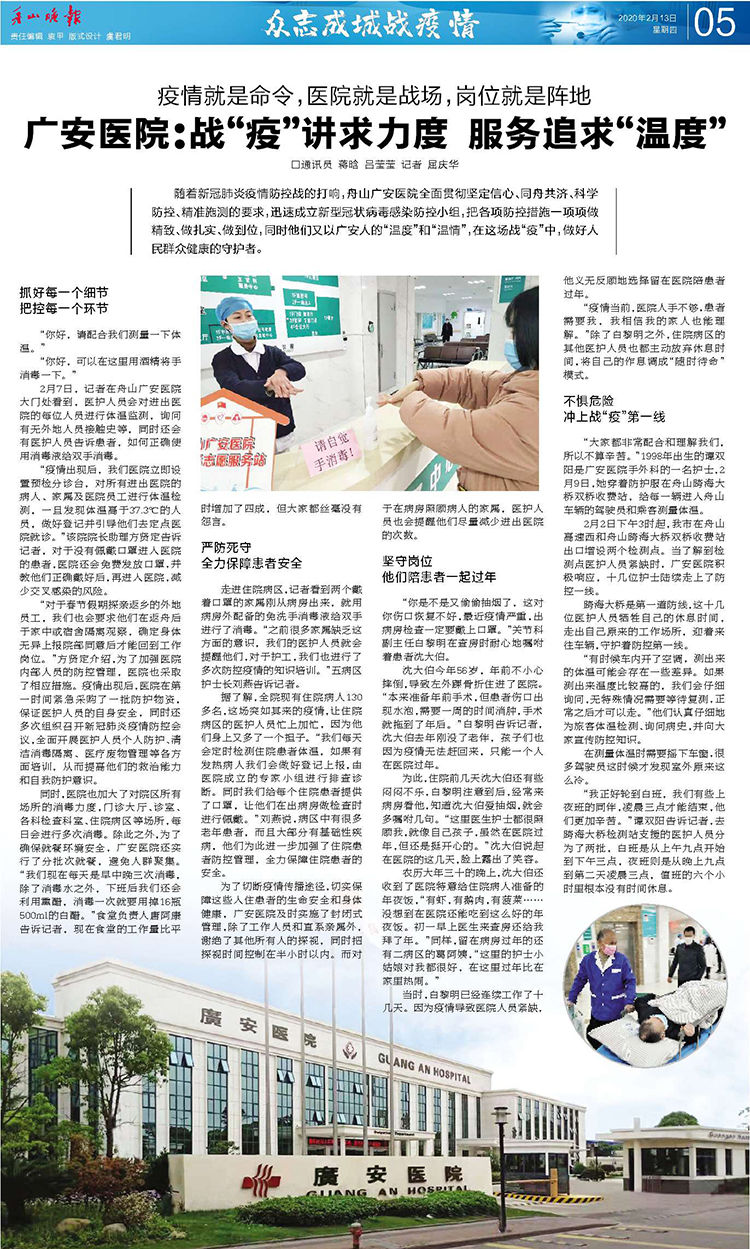 廣安人懷揣著對于醫(yī)療的敬畏和對舟山人的大愛,將以更加昂揚的姿態(tài)和海納百川的胸懷,不斷把學科建設和醫(yī)療技術(shù)水平推向更高的境界,服務舟山、造福社會。