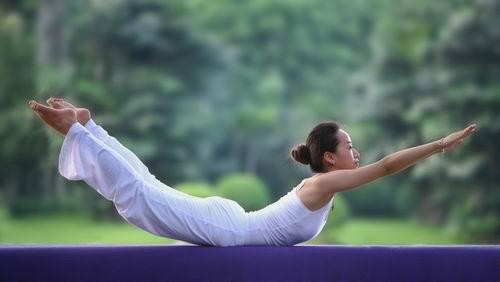 俯臥于床,用力挺胸抬頭,雙手向前伸直,膝關(guān)節(jié)伸直,兩腿向后用力,使頭、胸、四肢盡量抬離床面,似燕子飛狀,故名“飛燕式”。每次持續(xù)3~5秒,然后肌肉放松休息3~5秒,此為一個(gè)周期。